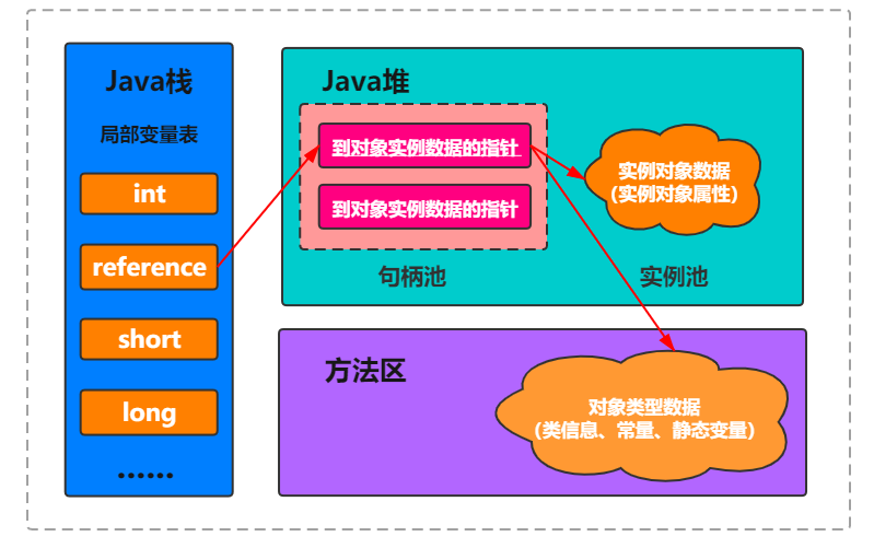 句柄:在堆中划分出一块内存作为句柄池,reference 中存储的就是对象的句柄地址,而句柄中存储着对象实例数据和数据类型的地址。这种方式比较稳定,因为对象移动的时候,只改变句柄中的实例数据的指针,reference 是不需要修改的。直接指针:即 reference 中存储的就是对象的地址。这种方式的优势就是快速,因为少了一次指针定位的开销句柄方式配图: