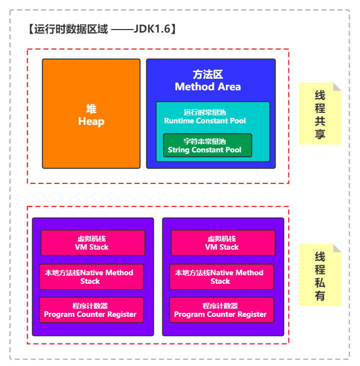 线程共享部分: 程序计数器虚拟机栈本地方法栈线程私有部分 堆方法区(JDK 1.8 变为了元空间,元空间是位于直接内存中的)注:我们配图以 JDK 1.6 为例,至于发生的变化我们在下面有说明