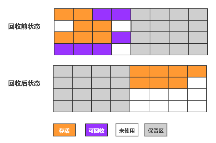 但是对于多数对象都是可回收的情况,算法需要复制的就是占有少数的存活对象每次都是针对整个半区进行内存回收,分配内存时,也不用考虑有空间碎片的复杂情况,只要移动堆顶指针按顺序分配即可