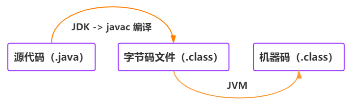 首先通过IDE/编辑器编写源代码然后经过 JDK 中的编译器(javac)编译成 Java 字节码文件(.class文件),字节码通过虚拟机执行,虚拟机将每一条要执行的字节码送给解释器,解释器会将其翻译成特定机器上的机器码(及其可执行的二进制机器码)。