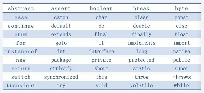 为什么这么说呢?我们拿Java和Python出来给大家看看。我们先来看看使用量最多的Java语言。Java的英文单词、学名关键词或者保留字,也就几十个。下面是Java的关键词: