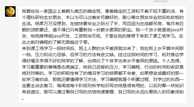 这位同学已经就业场长对同学说的这句印象很深:学习编程,付出的时间和收获是绝对对等的。