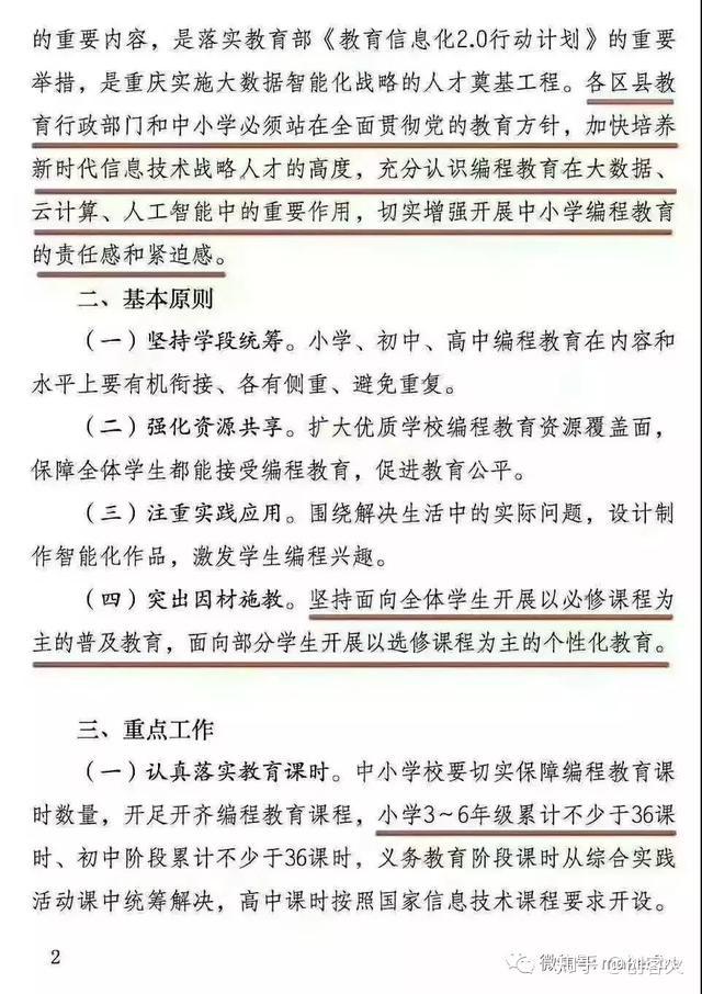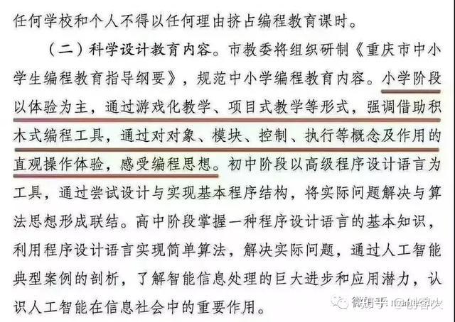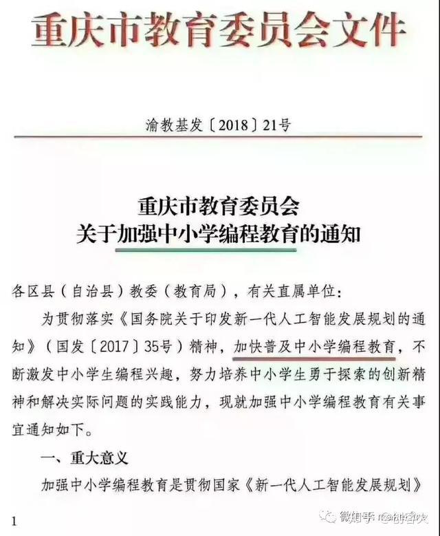 近日,重庆市教委下发《关于加强中小学编程教育的通知》,要求各中小学开足开齐编程教育课程,小学3~6年级、初中阶段均累计不少于36课时,各中小学至少配备1名编程教育专职教师。