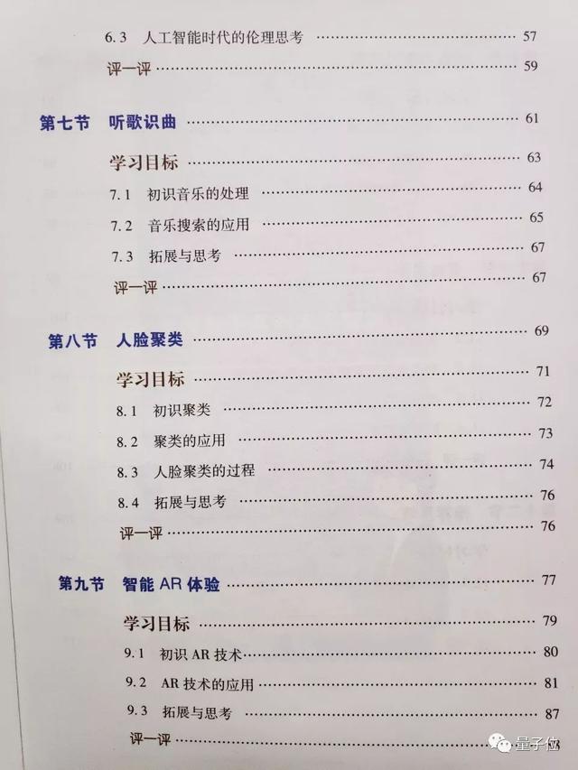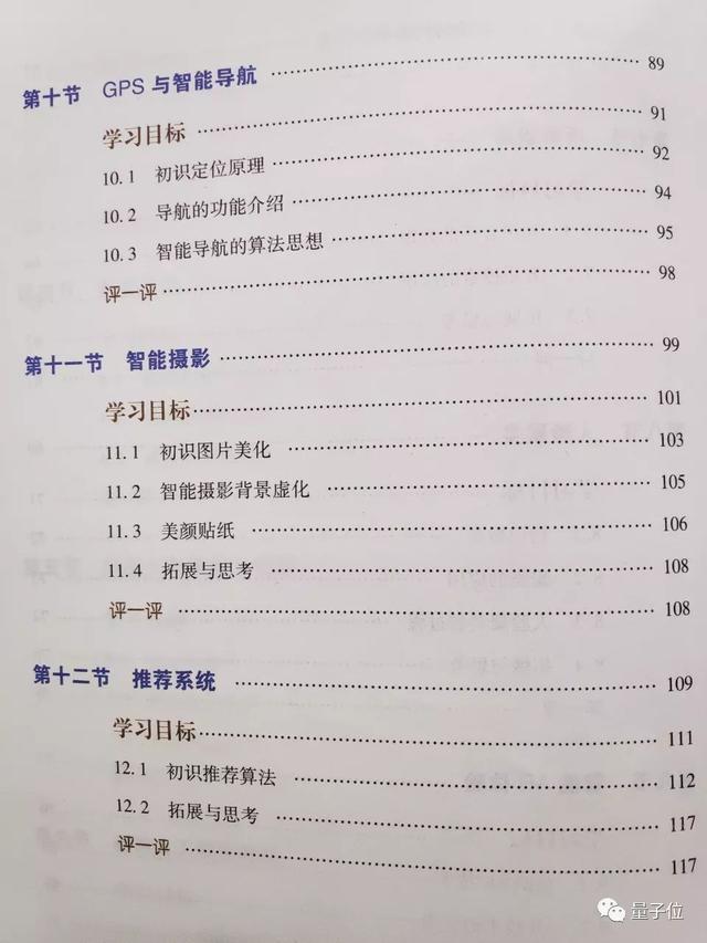小学版的课本一共六册,这里展示的是第一册,只有117页,共12个章节,前半部分在说AI的一些基础方向和原理,包括计算机视觉、机器学习等,后半部分就到了应用环节,包括人脸识别、AR、识别音乐、智能修图、推荐系统等,中间穿插AI相关的伦理和价值观。
