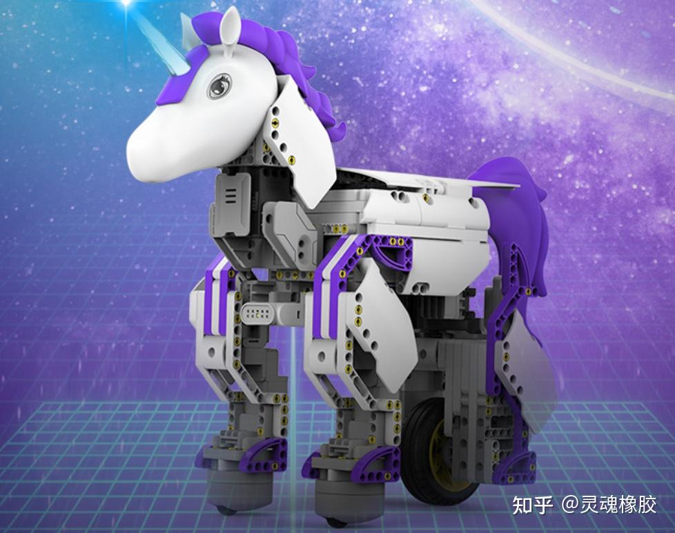 它可是内置传感器8大指令模块、3D可视化编程、兽角七彩渐变颜色、可DIY拼搭、内置私服舵机及运动电机,拼搭好以后通图形编程可以控制独角兽的前进后退等