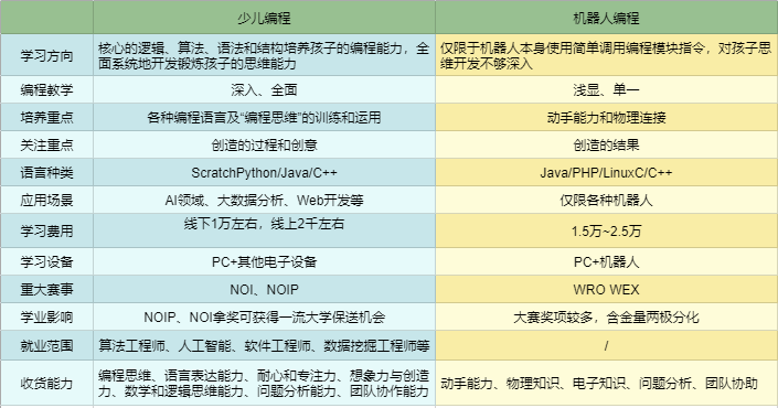 看看上面这张,家长就明白了机器人编程和少儿编程的本质区别了!