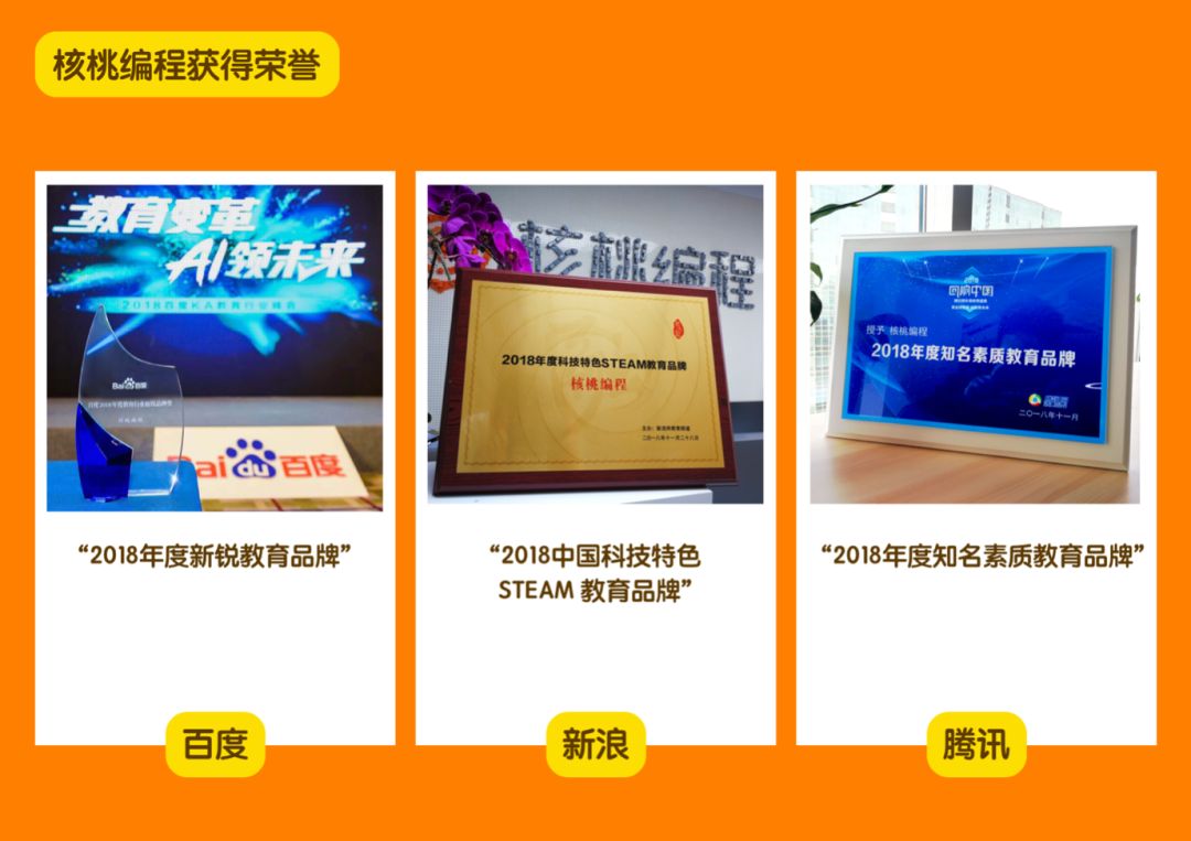 核桃编程一直是少儿编程界的大佬,核桃总体的学员量突破了30万人,学过核桃课的孩子遍布海内外。2018年,核桃分别斩获百度、腾讯、新浪三大教育类奖项,还登录CCTV、被新华社等众多媒体专门报道。