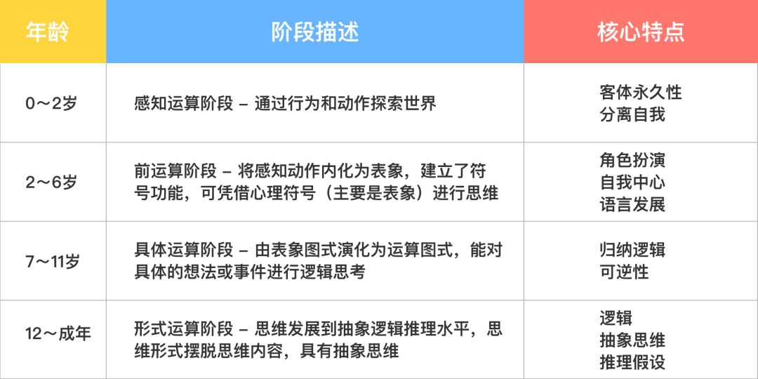 瑞士儿童心理学家皮亚杰曾提出了儿童认知阶段发展理论,将孩子的思维发展划分为四个阶段: