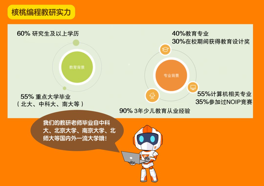 主讲老师王宇航是中科大计算机专业毕业的,曾获得世界机器人大赛“ROBOCUP”冠军。核桃编程的教研老师来自北大、北师大、中科大、南大等全国各地知名院校,除了对少儿编程教育领域颇有研究外,不少还是儿童心理及行为研究等领域的顶尖人才。