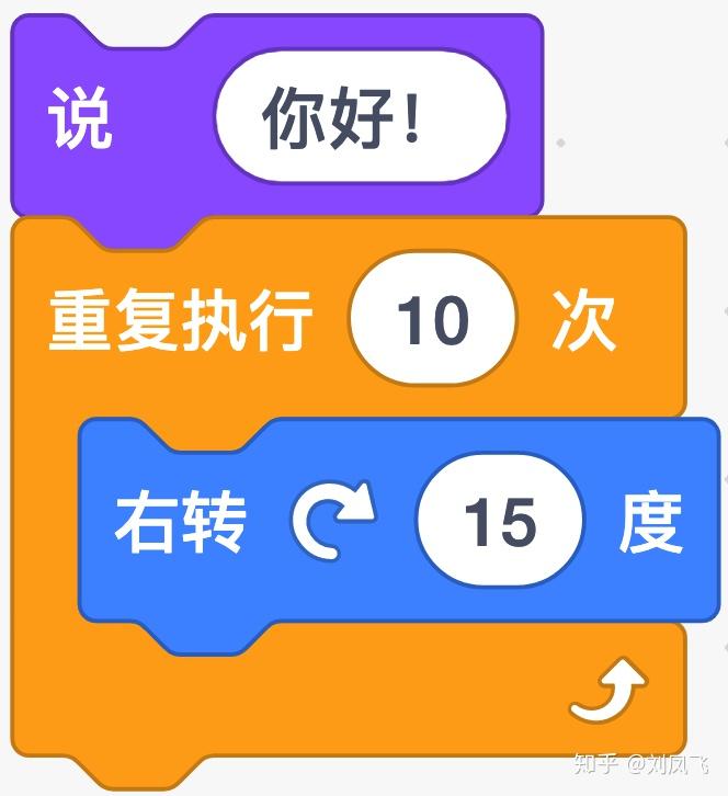 将“说你好!” 积木块、“重复执行10次”积木块、“右转15度”积木块组合在一起。