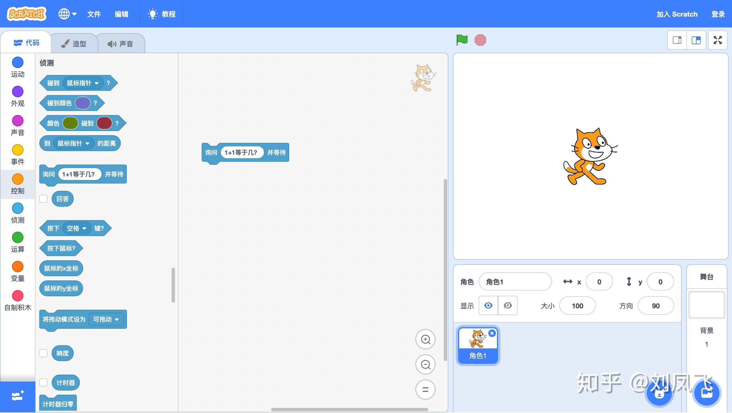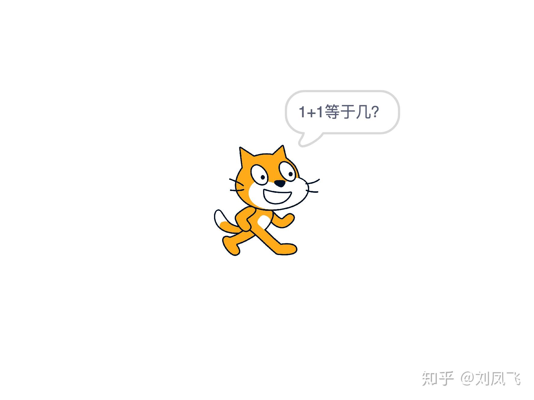 (8)点击脚本区的整个积木块,小猫咪出了一个考题“1+1等于几?”,等待你的回答。