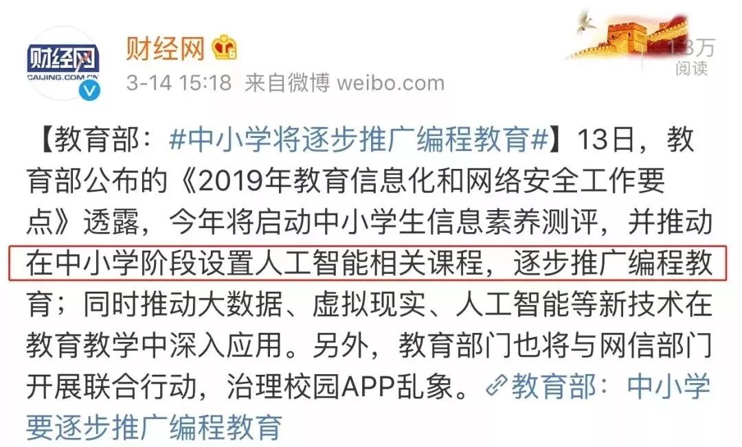 而我国虽然逐步加强了对编程教育的重视,但今年3月,教育部才官宣:将在中小学逐步推广编程教育。