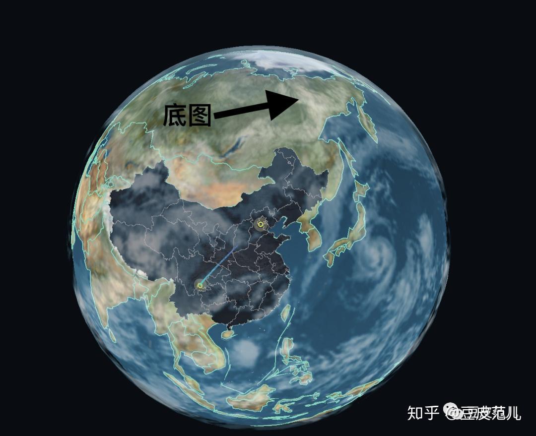 比如绘制中国地图,底图可以用一个世界地图简化图,为了让用户熟悉的物理环境,帮助用户更好的确定位置。或者用一个三维地球来描述,基础底图位于地图最底层。