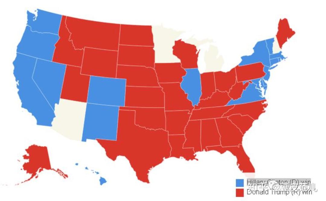 可以看到蓝州民主党(希拉里)主要分布西海岸和东北部。这些地区两级分化严重,精英阶层和下层人士,分别是精英特权和政府福利的受益者。红州共和党(特朗普)主要分布在中部地区。这些地区传统农业/行业为主,思想相对保守,奉行自己努力,白手起家,反对大政府主义。
