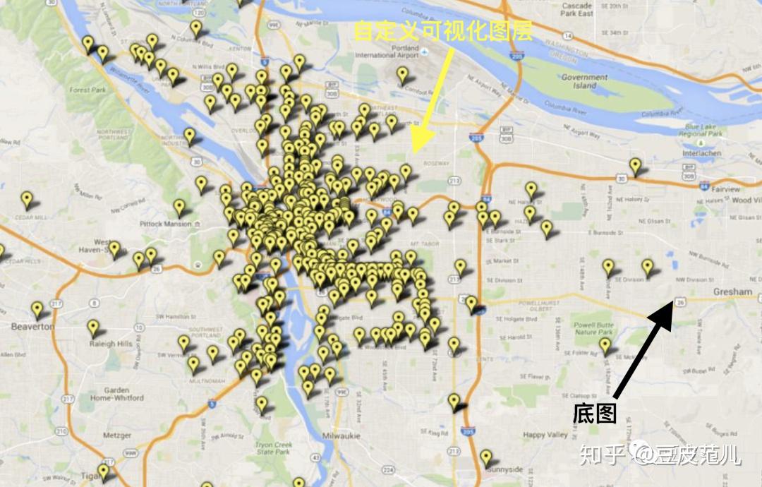 首先,数据大致可分为两种。底图数据和自定义可视化图层数据。底图通常只用做地理信息的表达,例如MapBox、Google地图等。一般流程是在地理信息底图的基础上,加入不同的自定义可视化图层,比如柱状图,热力图,飞线呼吸点,或者一些mark标记等(后续Data 自定义数据层会详细介绍)。关系大致如下: