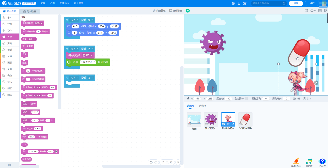 实际上小编看到的其实比他描述的还要“复杂一点”,他用简单的积木代码,加上腾讯扣叮中自家免费素材库制作了一个:猫小萌遇到了病毒。按下R之后会召唤出来一个身穿防护服的医生,再按下Q就可以发射小药丸,当小药丸触碰到病毒时,病毒就被消灭了。说实在的,这在我看来简直是非常简单的逻辑,但是小侄子才刚上3年级,这种逻辑他能够理清楚并且自己拼接、制作出来,小编还是非常佩服的。毕竟我三年级的时候,还在玩积木……