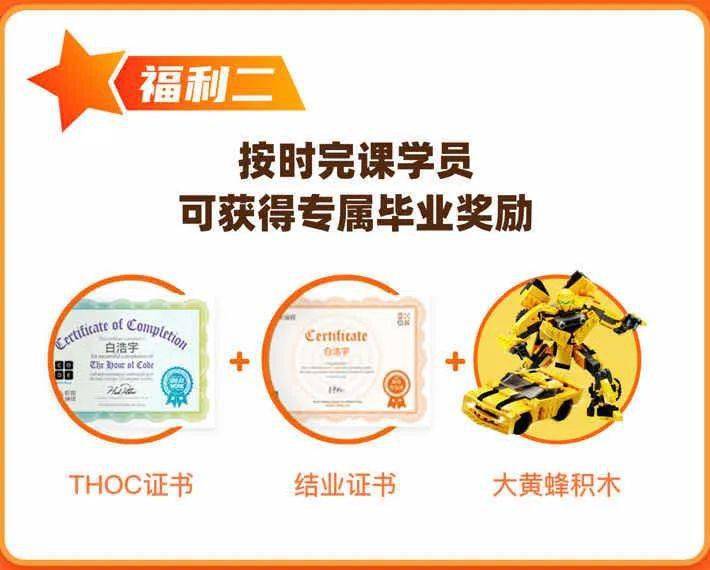 3、按时完成课程的小朋友,可以获得证书,还有酷炫的大黄蜂积木,充实又有趣!