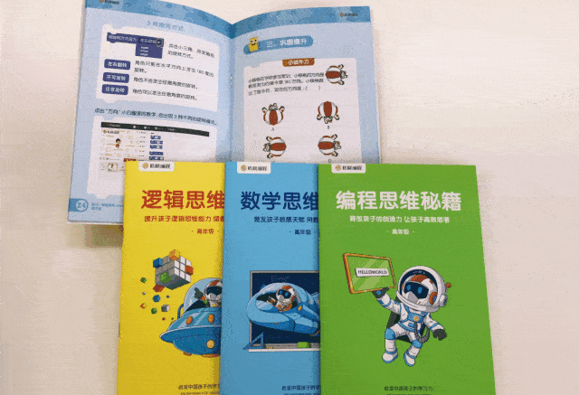 4本学生配套书,分别从逻辑思维、数学思维、编程思维、scratch启蒙4个方面锻炼孩子的底层思维力。