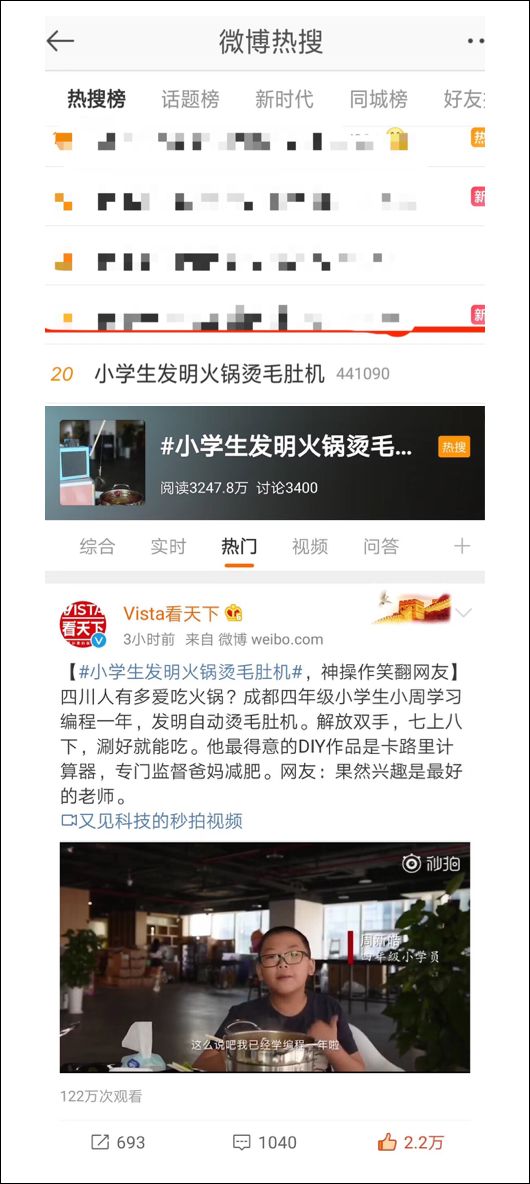 就在前两天,西瓜创客的一名小学生用编程自制的「火锅烫毛肚机」还上了微博热搜榜——