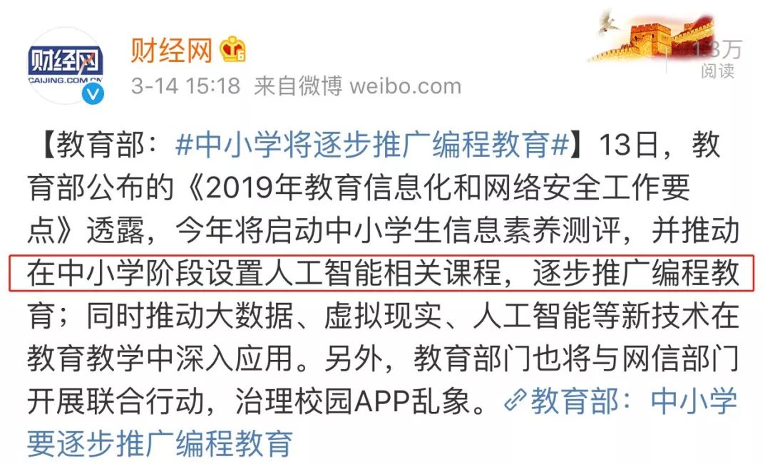 今年3月14日,教育部官宣:今年将在中小学里开始推广编程教育。