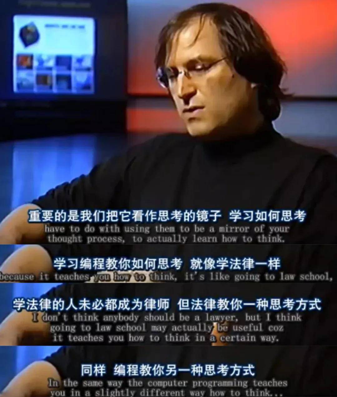 乔布斯在纪录片《乔布斯:遗失的访谈》中说:“我认为每个人都应该学习编程,因为它会教给你如何思考。”