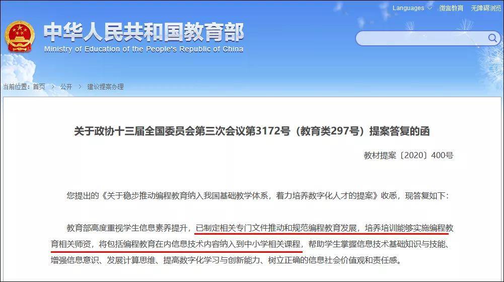 2020年12月,教育部也下发了正式通知,明确将编程教育纳入中小学相关课程。