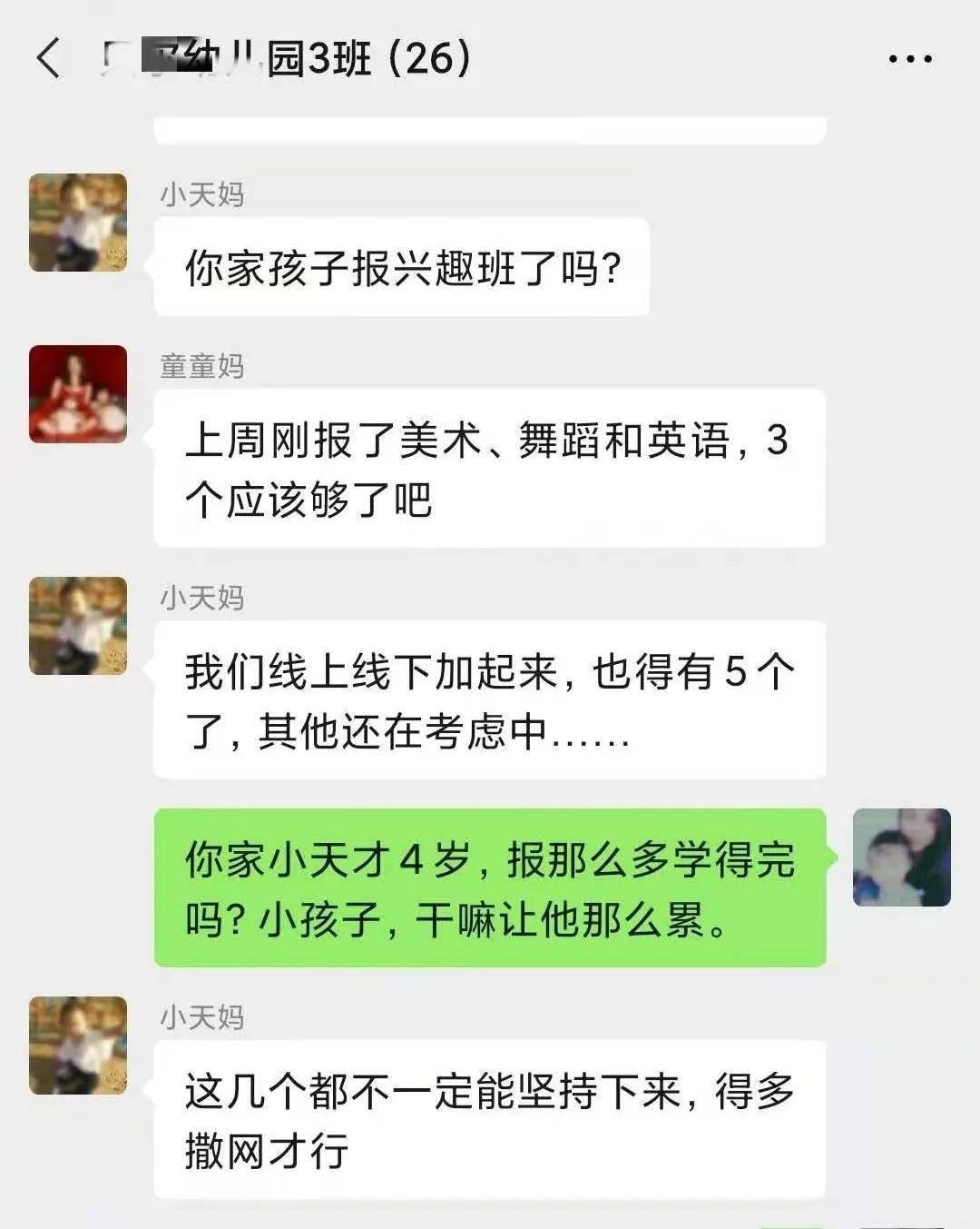 这不,家长群里的几个妈妈就在讨论:该给孩子报什么兴趣班?