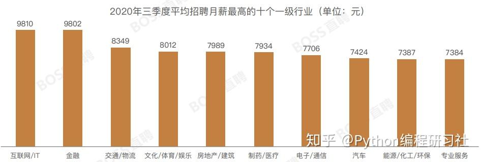 2) 2020年三季度平均招聘月薪最高的十个一级行业