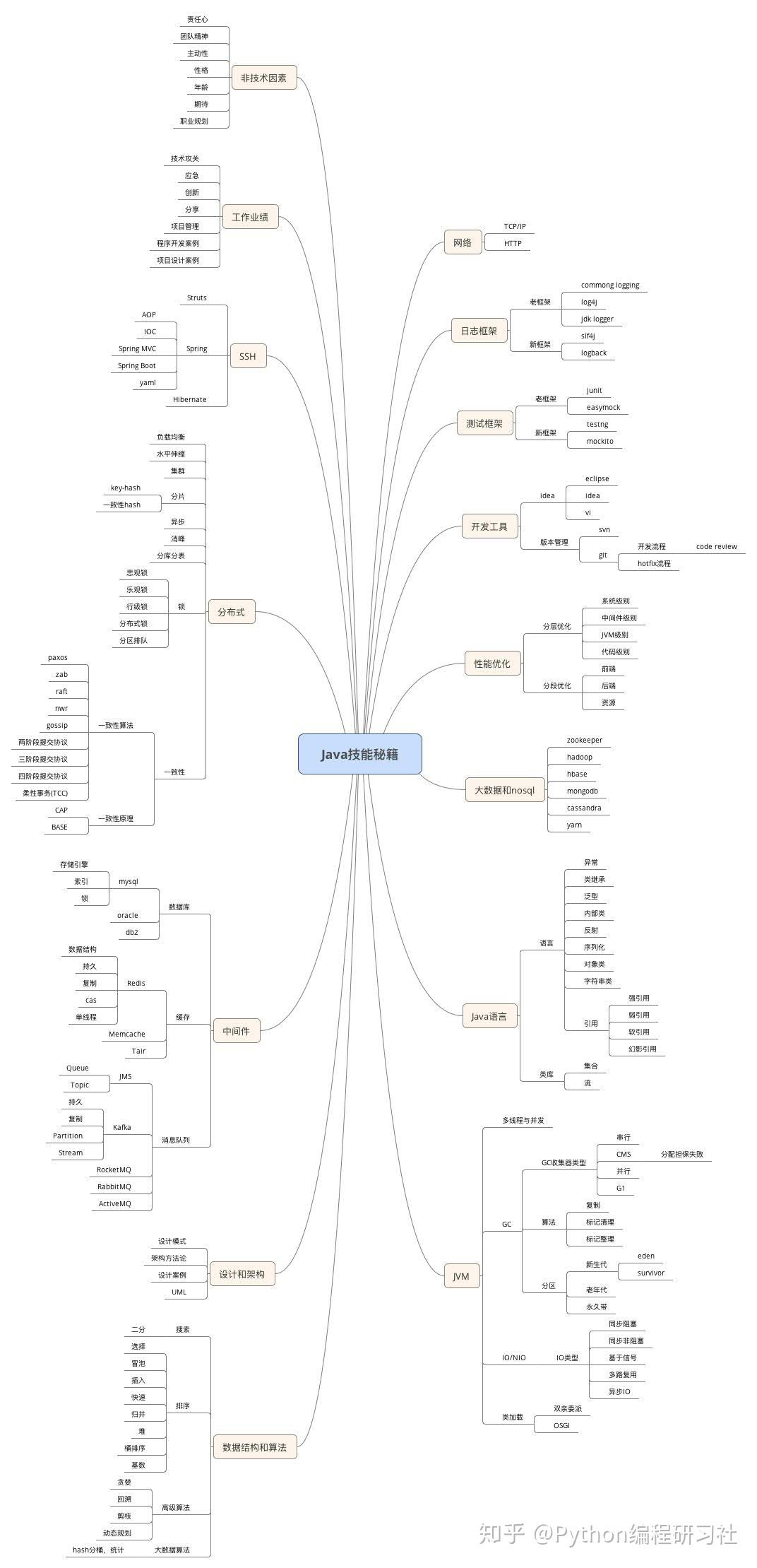举个例子,要成为后端架构师,你就可以选择学习Java语言以及Java企业开发知识体系。下面是从网上搜集的Java架构师知识图谱,供参考: