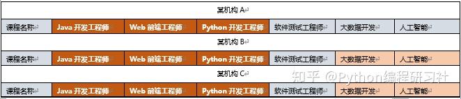 1天时间的调研,主要是调研官网以及电话联系招生人员,这3家机构的人员非常热情,分别介绍了自家的主推培训课程,这些课程市场需求大,就业前景好。如下图所示,其中橘红色的是主推课程:
