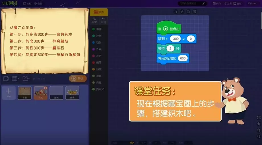 在小码精灵的课程中,坐标系的运用始终贯穿在课程学习里面,通过游戏的方式将知识更直观的展示在孩子面前: