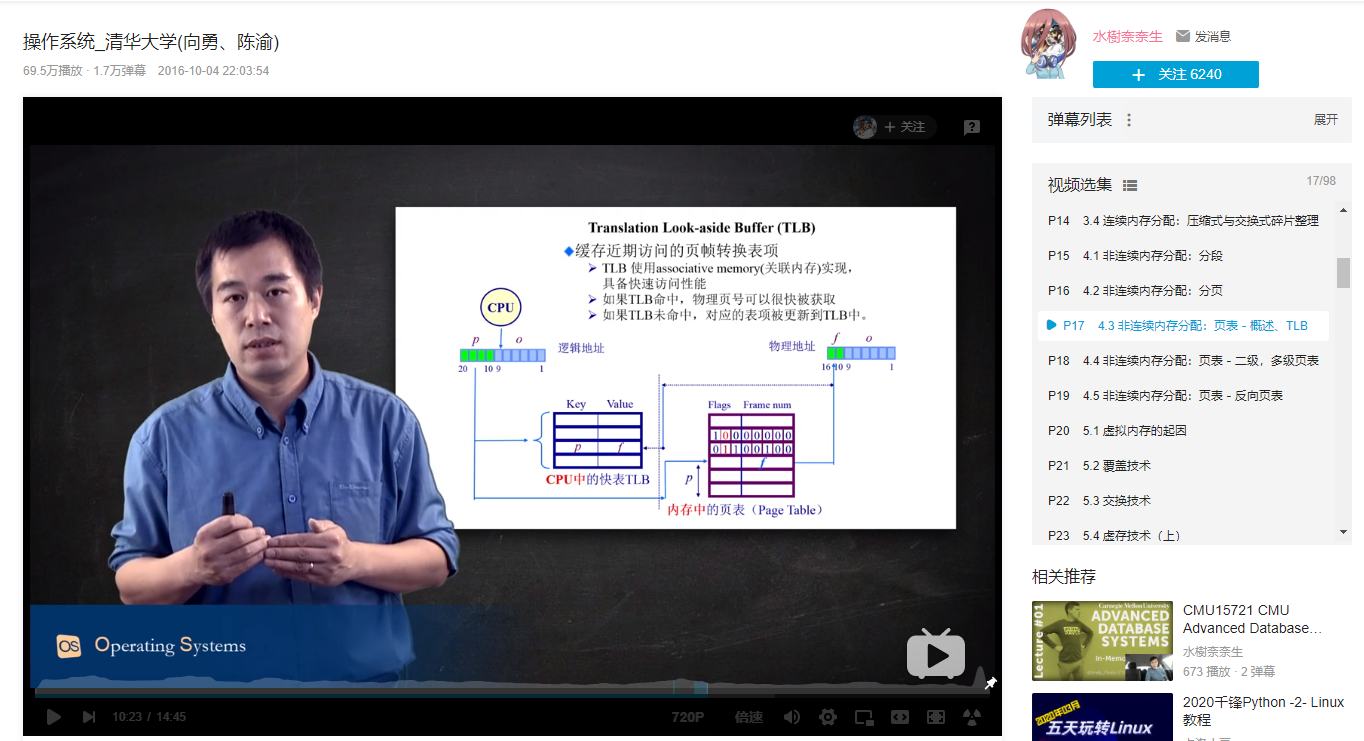 B 站关于操作系统课程资源很多,我在里面也看了不同老师讲的课程,觉得比较好的入门级课程是《操作系统 - 清华大学》,该课程由清华大学老师向勇和陈渝授课,虽然我们上不了清华大学,但是至少我们可以在网上选择听清华大学的课嘛。课程授课的顺序,就如我前面推荐的学习顺序:「内存管理 -> 进程管理 -> 文件系统管理 -> 输入输出设备管理」。