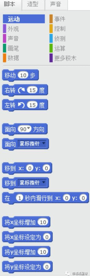 这里面最好懂的就是Scratch,它是大白话的中文,不需要孩子懂英语,也不需要会打字,因为它的指令被做成了一个个的图标,只要用鼠标把指令拖到一起就行了。