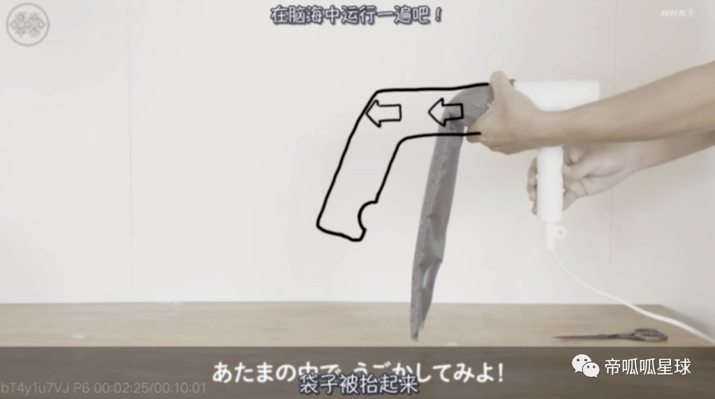 然后,把洞口朝下,还是同样,用吹风机往里吹风,袋子会怎么样呢?