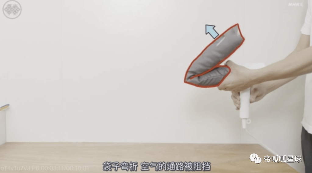 袋子弯折,空气的通路被阻挡,袋子掉下来,接着重复上面的过程。