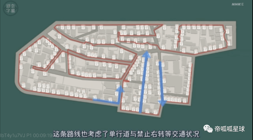 这就是配送时的最短路径。这条路线还考虑了单行道、禁止右转等等交通状况,是一条经过了程序化设计的路线。