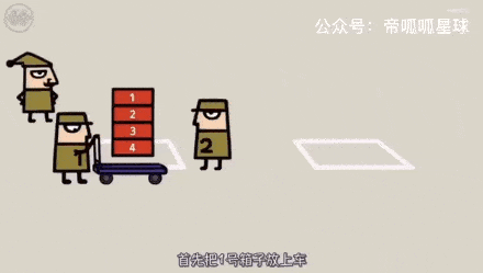 接着,从手推车上把箱子再一个个搬下来: 4号先搬下来,放在最下面; 1号最后一个搬下来,放在最上面。