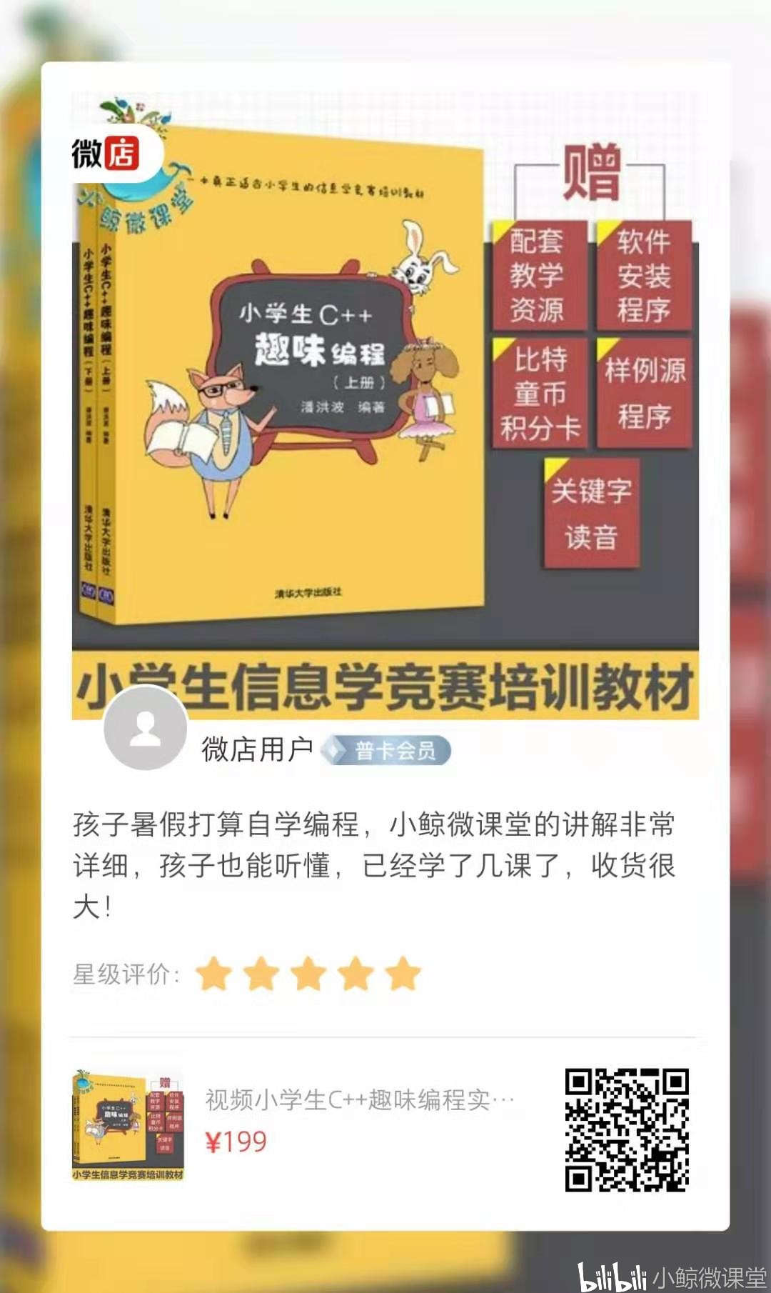 《小学生C++趣味编程》一书由潘洪波编著,清华大学出版社出版,受到了广大小朋友的欢迎。但是有也很多孩子和家长表示,只看书还是不容易理解,如果有配套讲解视频就好了。鉴于此,我以此书为蓝本,制作了全书讲解视频,带领孩子们消除学习障碍,获得编程中的乐趣。达到依靠孩子自己,也能顺利完成学习的目标。同时,我也会把一些书上没有的知识,找一些“课外”的难度稍大的题目,附加样例代码,拓宽孩子们的学习范围,引起孩子们的学习兴趣。