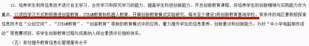 提出开发创新教育课程,将培养学生的创新精神与实践能力作为重点,以项目学习方式积极推进创客教育、STEAM教育和机器人教育,开展创新教育模式实验研究,每市至少建设3所创新教育基地学校。