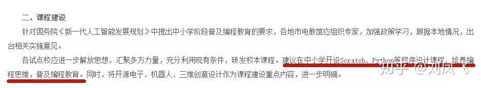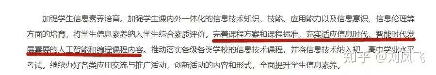 计划提出,完善课程方案和课程标准,充实适应信息时代、智能时代发展需要的人工智能和编程课程内容。推动落实各级各类学校的信息技术课程,并将信息技术纳入初、高中学业水平考试。