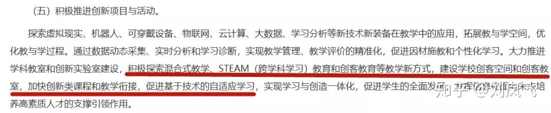 要求大力推进学科教室和创新实验室建设,积极探索混合式教学、STEAM(跨学科学习)教育和创客教育等教学新方式,建设学校创客空间和创客教室,加快创新类课程和教学衔接,促进基于技术的自适应学习。