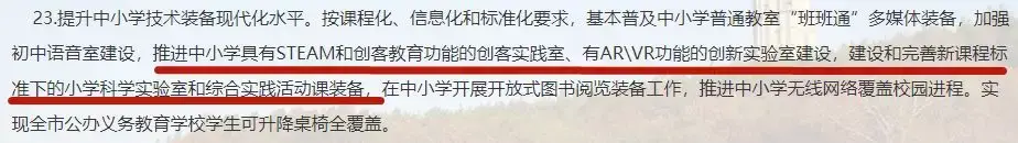 要求:推进中小学具有STEAM和创客教育功能的创客实践室、有ARVR功能的创新实验室建设;建设和完善新课程标准下的小学科学实验室和综合实践活动课装备。