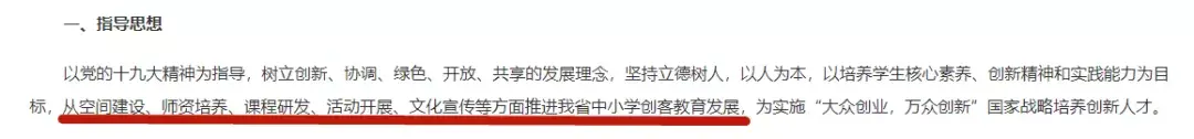 指出要以培养学生核心素养、创新精神和实践能力为目标,从空间建设、师资培养、课程研发、活动开展、文化宣传等方面推进我省中小学创客教育发展,为实施「大众创业,万众创新」国家战略培养创新人才。