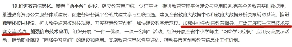 (5)2018年3月7日,湖北省教育厅印发《省委高校工委 省教育厅2018年工作要点》提出推进教育信息化,加强中小学创客教育指导,广泛开展师生信息技术竞赛交流活动。