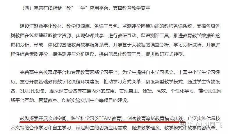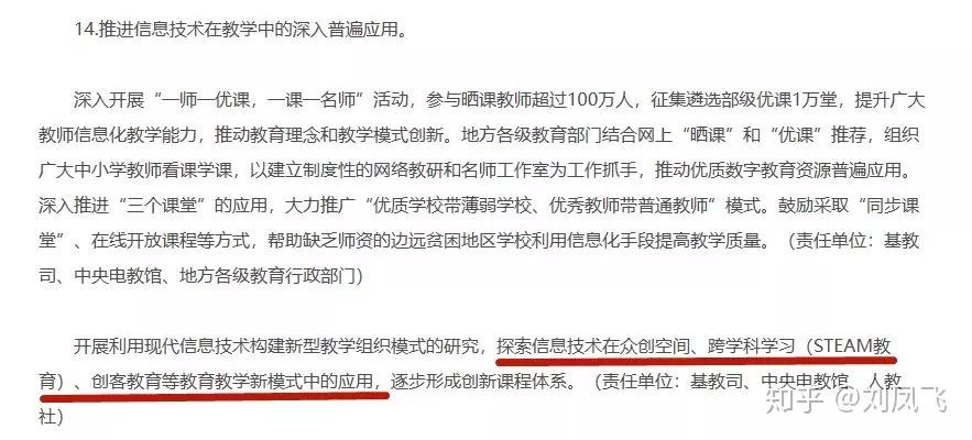文件指出「推进信息技术在教学中的深入普遍应用,开展利用现代信息技术构建新型教学组织模式的研究,探索信息技术在众创空间、跨学科学习(STEAM教育)、创客教育等教育教学新模式中的应用,逐步形成创新课程体系(责任单位:基教司、中央电教馆、人教社)。