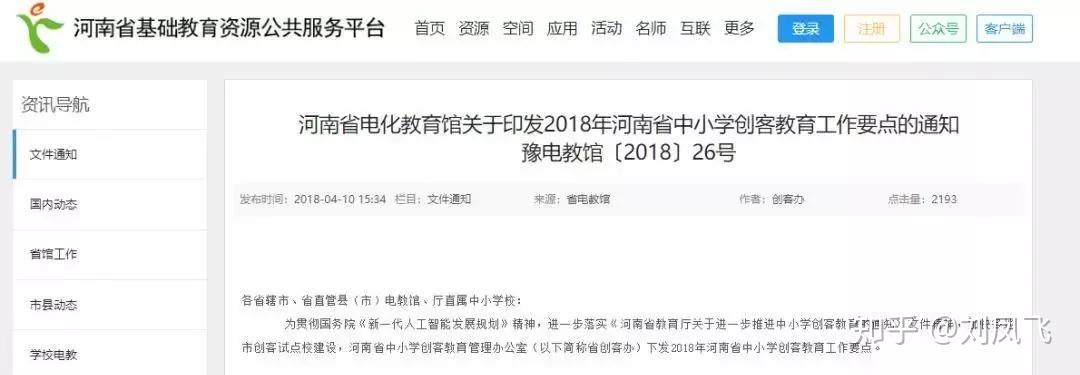 (7)2018年4月10日,河南省电化教育馆印发《2018年河南省中小学创客教育工作要点的通知》,针对国务院《新一代人工智能发展规划》中提出中小学阶段普及编程教育的要求,各地市电教馆应组织专家,加强政策学习,跟据本地情况,出台相关实施意见。