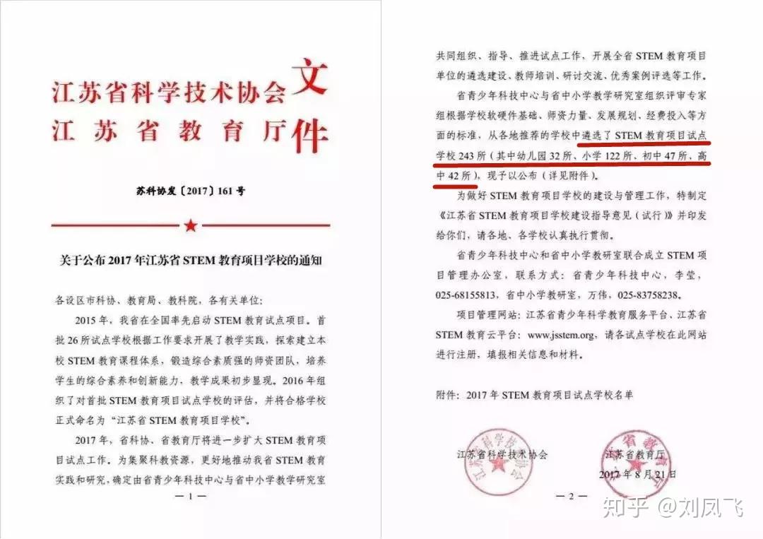 (3) 2017年9月江苏省印发了《江苏省STEM教育项目学校建设指导意见(试行)》,并公布了243所STEM教育项目试点学校(其中幼儿园32所、小学122所、初中47所、高中42所)。