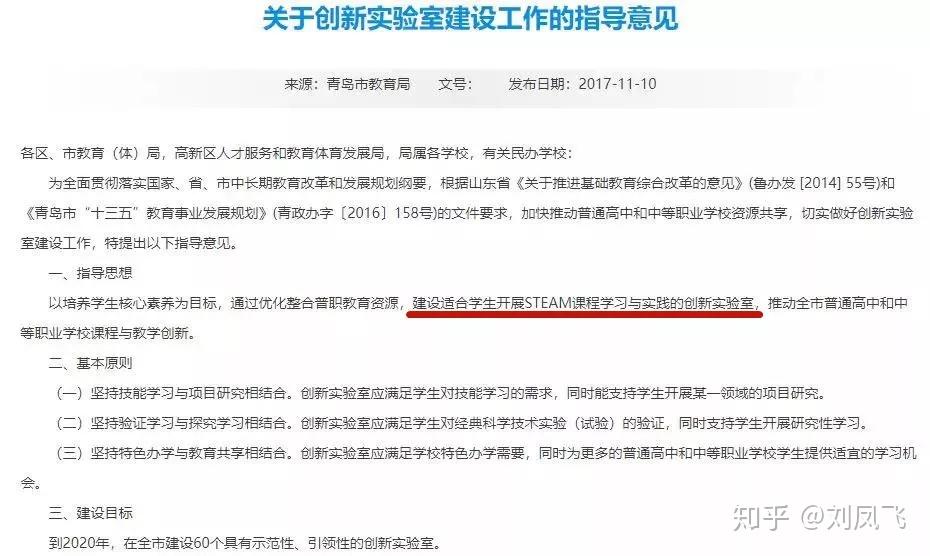 (14)2017年11月,青岛市市教育局下发《关于创新实验室建设工作的指导意见》,明确建设适合学生开展STEAM课程学习与实践的创新实验室。到2020年,要在全市建设60个具有示范性、引领性的创新实验室。