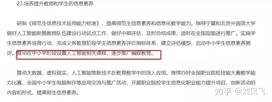 通知中透露:今年将启动中小学生信息素养测评,并推动在中小学阶段设置人工智能相关课程,逐步推广编程教育;同时,推动大数据、虚拟现实、人工智能等新技术在教育教学中深入应用。