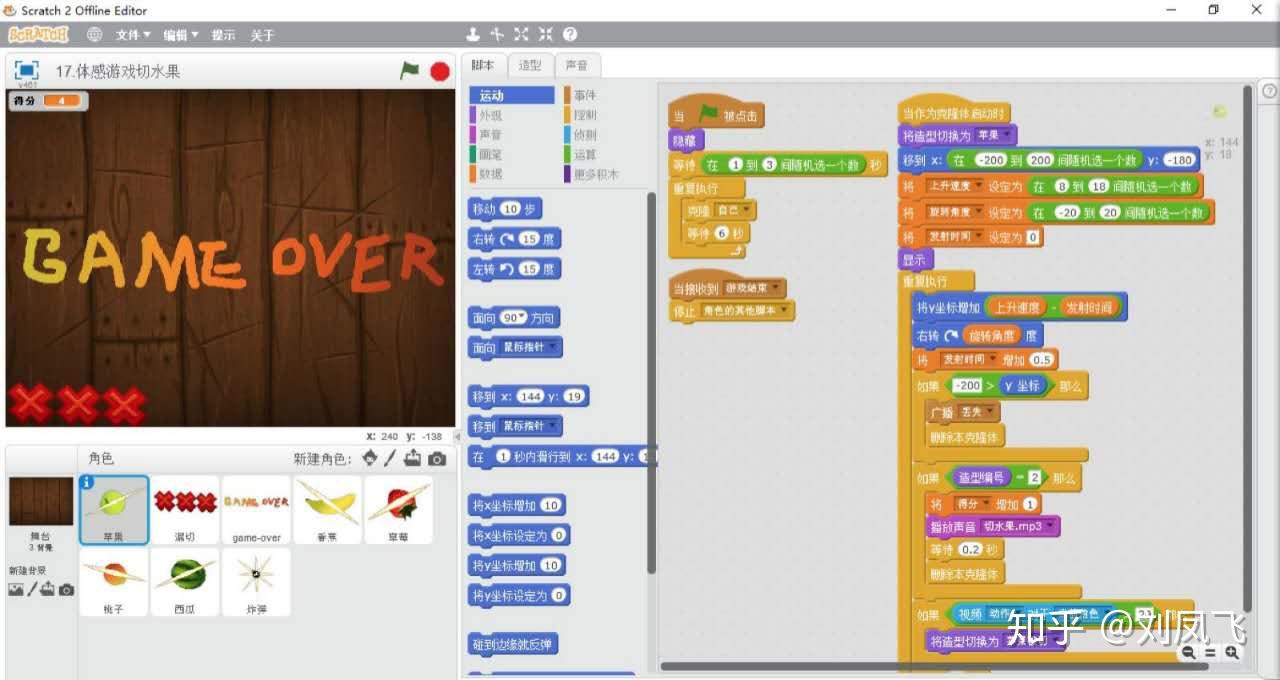 所以使用它可以很好的锻炼孩子编程思维的,所以孩子可以很轻松的使用Scratch完成一个体感切水果游戏。
